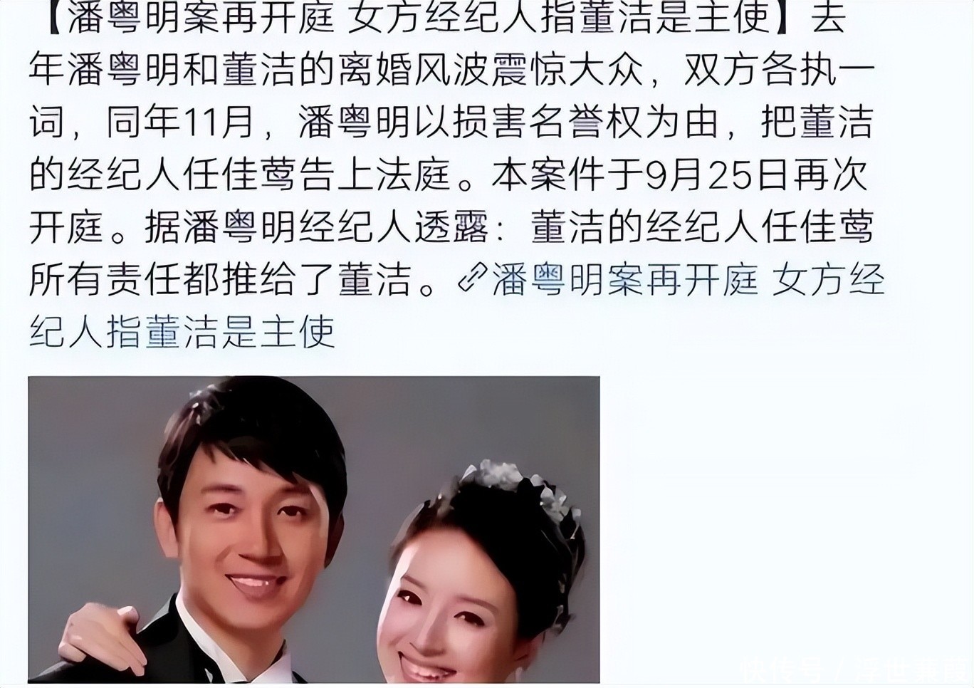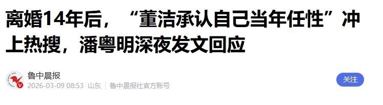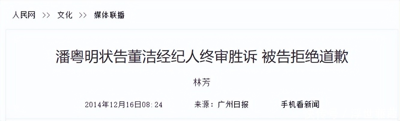 部分参考资料:离婚14年后,“董洁承认自己当年任性”冲上热搜,潘粤明深夜发文回应——鲁中晨报潘粤明状告董洁经纪人终审胜诉 被告拒绝道歉——人民网