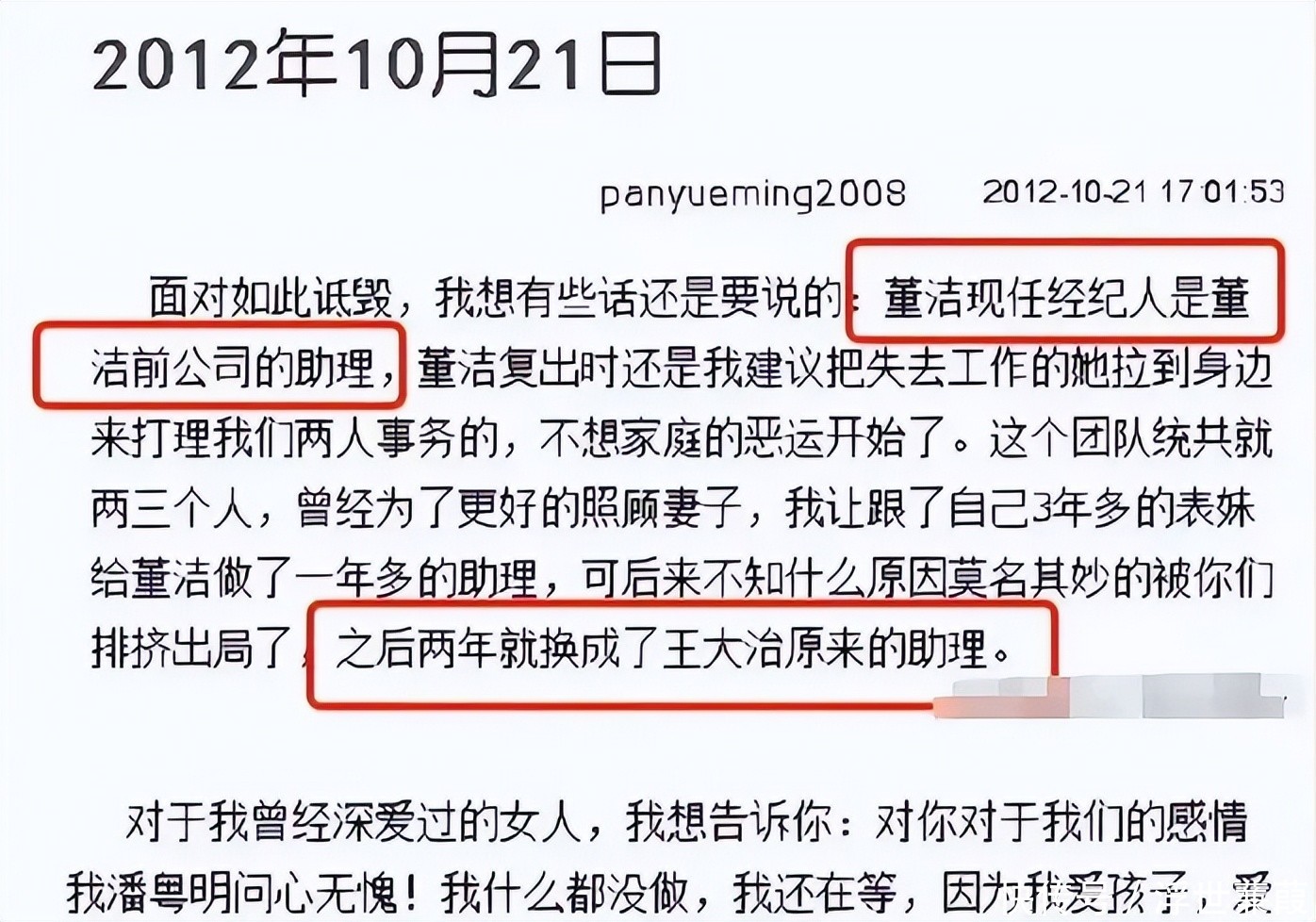 潘粤明前经纪人曾在朋友圈写道:“老爷子病危想见孙子最后一面,董洁回复‘我没有这个义务’。”